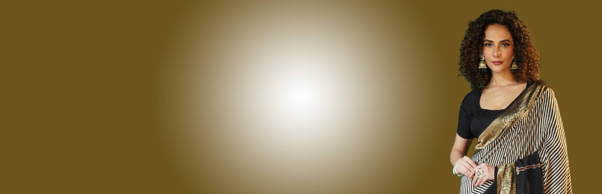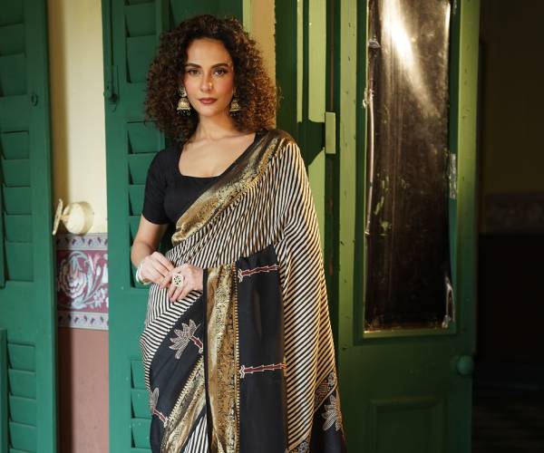 This black and white striped saree is a rare find, featuring bold patterns and a rich gold border that makes it truly stand out. The fabric feels like a dream—incredibly soft, light, and expensive against your skin as you move. It is a prized piece that brings a sense of high-end luxury to every kitty & cocktail party or special gathering.